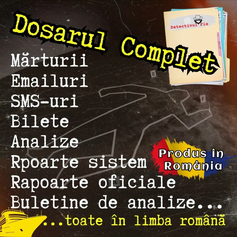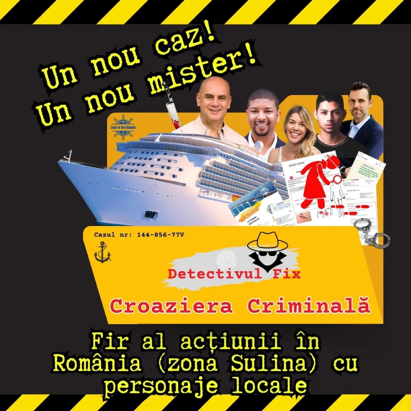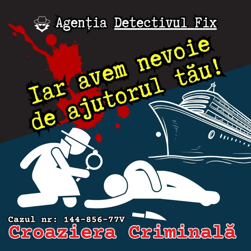 Pe vasul de croaziera Zeus of the Danube care navigeaza de la Viena (Austria) catre Sulina (Romania) luxul, opulenta si all-inclusive-ul nu sunt chiar ceea ce par a fi… toata voia buna se transforma in groaza si oroare, atunci cand renumitul regizor si om de afaceri Stefan M. este gasit asasinat cu sange rece in cabina sa! Toti pasagerii sunt oripilati! Exista un criminal pe vasul de croaziera!! Politia din Romania a preluat cazul, intrucat crima s-a petrecut in apele romanesti. Vasul este sub control judiciar in portul Sulina (RO), pasagerii blocati la bord, alaturi de criminal… avem nevoie urgent, dar f. urgent de ajutorul tau sa descoperim criminalul!!! Un nou caz de investigatie si mister – dosarul detectivului Fix te asteapta in port! Produs in Romania, cu personaje locale! Hai pe croaziera sa dam jos criminalul cu bratari din metal la ambele maini! Un detective game 100% romanesc te astepta! Rezolva dosarul detectivului si hai in cursa de a face lumina in acest nou caz de la DetectivulFix.ro! Succes sa rezolvi engima criminala!